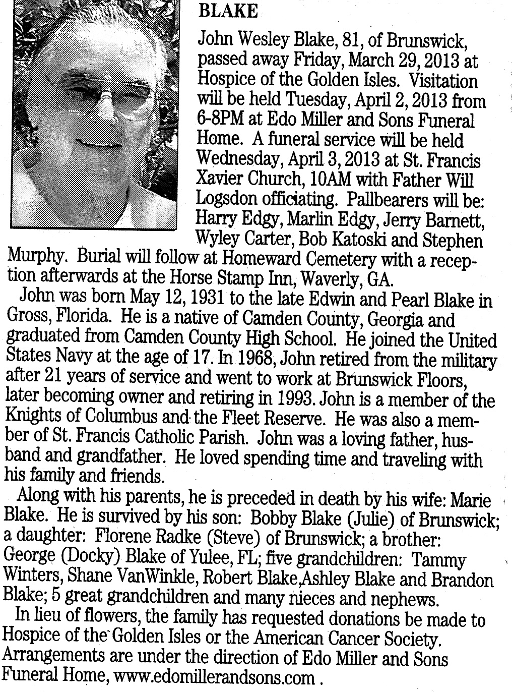 | Chief, John Blake In Memory of John Blake May 12, 1931 - March 29, 2013  dignity-memorial/obituary/John-Blake He will always be in our hearts. Jim and Tsui Ensey My prayers are for the family to be strong. John was a great shipmate and a former Commander of the Vance Association. A ship we served on in the 60's. ... Joseph Betters (West Harwich, MA) April 08, 2013 Our thoughts and prayers ar with the entire family at this difficult time. He was shipmate and a friend for many years. He will be greatly missed by us all. Fair winds and following seas. Robert and Diana Howey, Jacksonville, Florida |